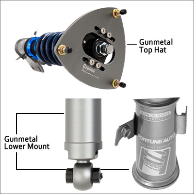 • Black front top hats with gunmetal rear top hats and lower mounts, bright dip black anodized spring perches and lower mount locking collars and silver springs